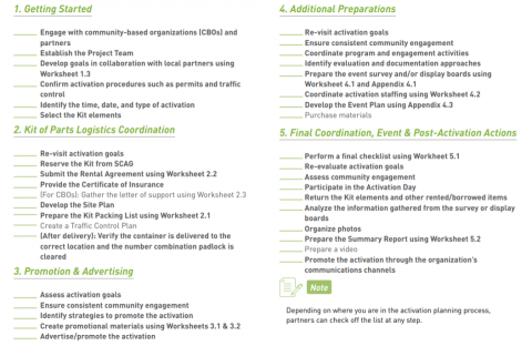 The Playbook serves as a comprehensive guide, beginning with project ideation. Pick your starting point! Depending on where a project team is in the activation planning process, plug into this Playbook at any step. From establishing a project team to setting project goals, the Playbook details timeframes, strategies, and required documents that will set up a project for success.